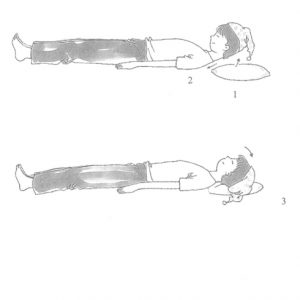 平躺時,讓頭部稍微提起(1),再放下(3),這樣的動作會讓我們的頸部更放鬆、放下貼近床面,讓頭部與身體產生更好的連結,再讓呼吸道更放鬆(3),讓呼吸自然平順放鬆,打呼問題就自然消失了。
