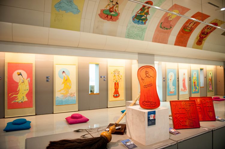 現場分別展出近四米高的主畫千手觀音,以及持蓮花手觀音、準提菩薩、四臂觀音等十餘幅高2.4米的諸尊觀音畫作,讓人自然生起寂靜喜悅之感。