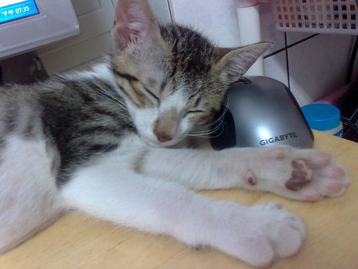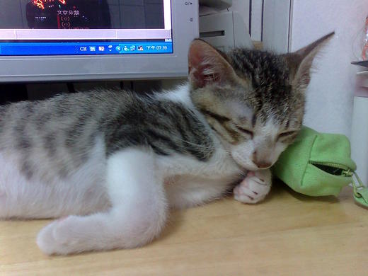 妙妙睡覺時喜歡靠著高一點的東西,舉凡筆袋、滑鼠、我的手、腳,無一倖免啊……哈哈。