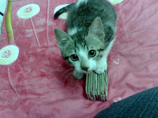 妙妙睜大眼睛裝無辜時,黃色的眼白部分就像一對月牙兒。
