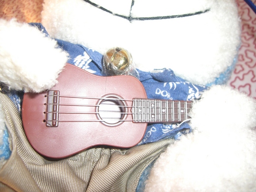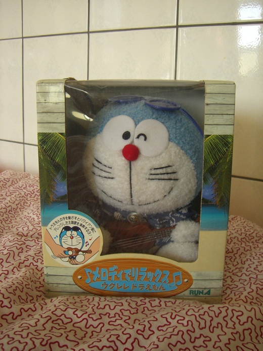 多啦a夢的右手裡有感應器,握著多啦的手去彈烏克麗麗就會發出聲音來,但是電池好像快沒電了,所以有點斷斷續續啦。