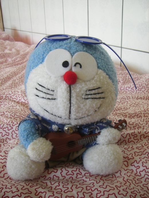 事實證明:多啦a夢彈的真的是烏克麗麗無誤,因為只有四條弦(吉他是六弦)。不過用相機拍把影片轉正後,我妹居然變扁了啦。