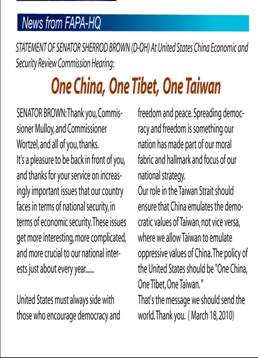 美國參議員~施諾德.布朗 (Sherrod Brown) 說:一個中國,一個圖博,一個台灣!