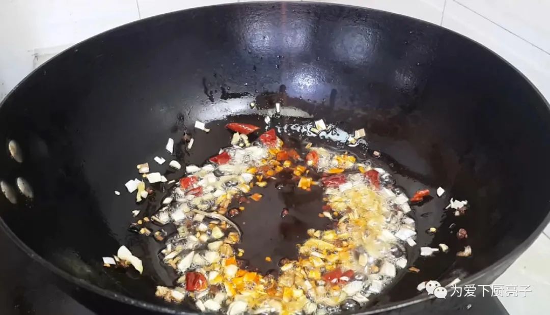 鍋底倒入一點油滑鍋,加入蔥薑蒜末,乾辣椒花椒,小火爆香以後,加入豆瓣醬或者火鍋紅油,再次小火爆香。