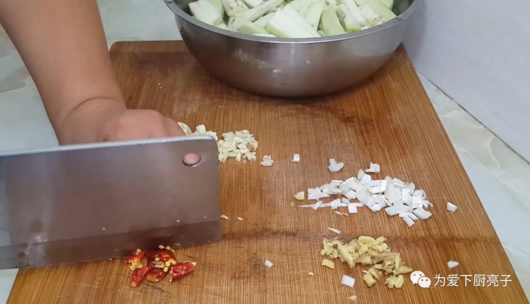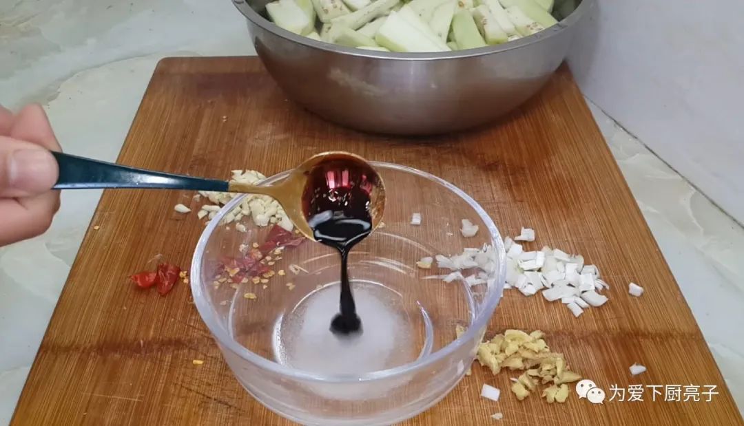 浸泡的茄子,不會發黑,並且切點蔥末,蒜末,薑末,辣椒碎。