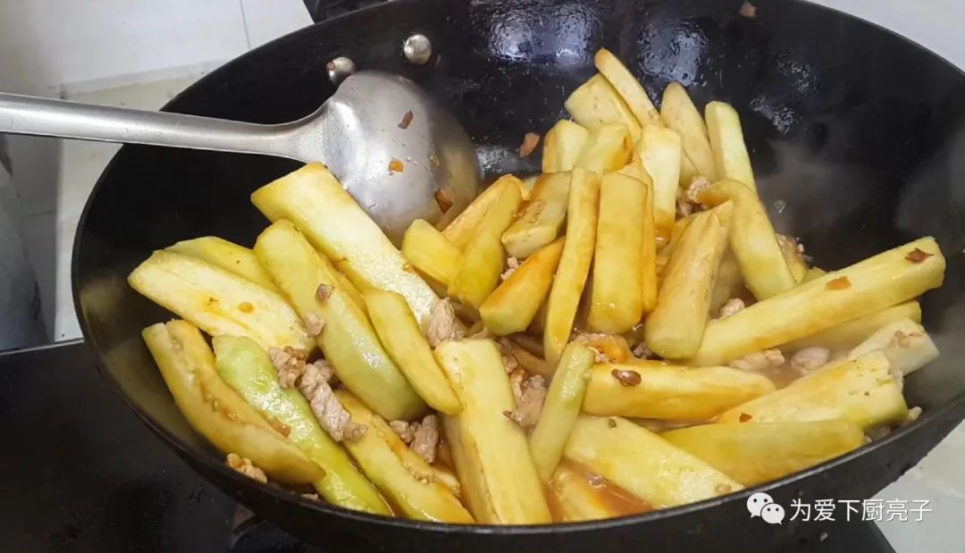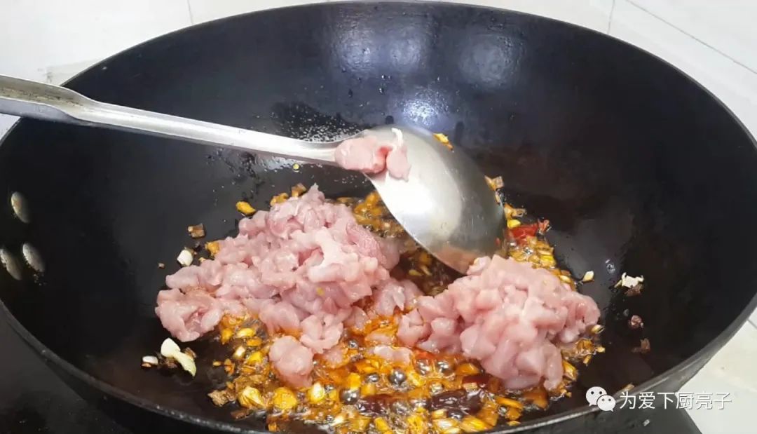 里脊肉炒出香味,倒入浸泡的茄子,再次翻炒均勻。