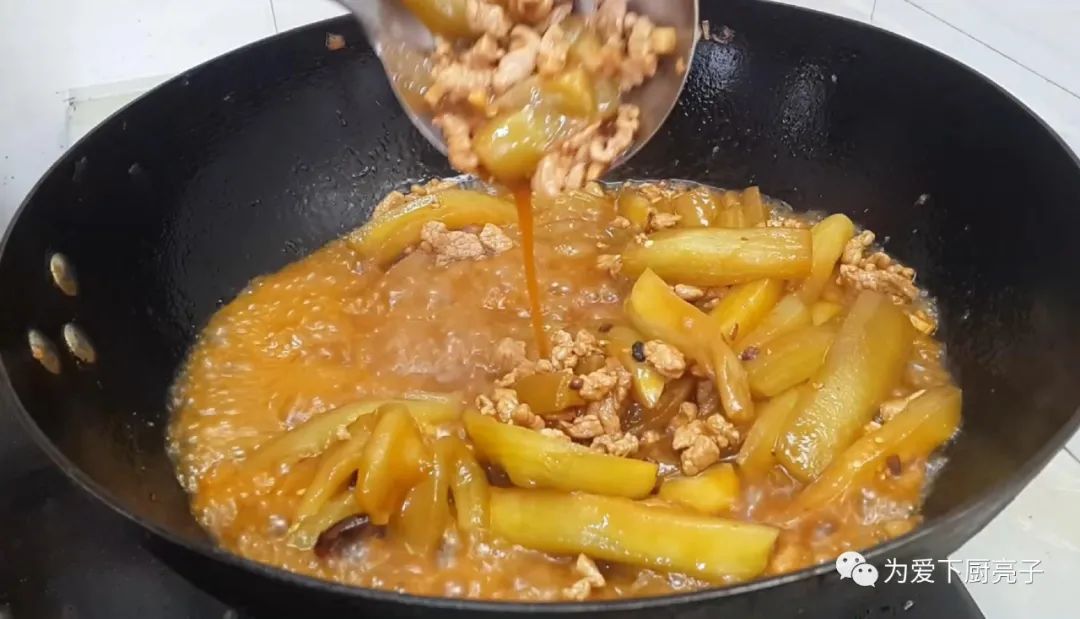 再次倒入料汁,翻炒燜煮,大約五分鐘左右。
