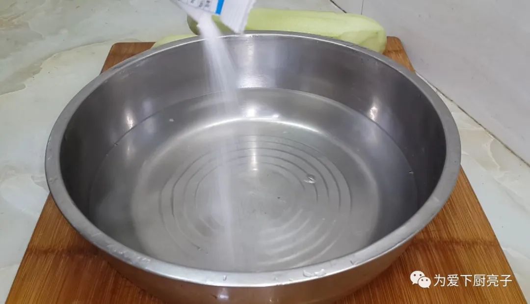 提起準備一盤涼水,加入適量的精鹽,攪拌一下,讓鹽和水充分融合。