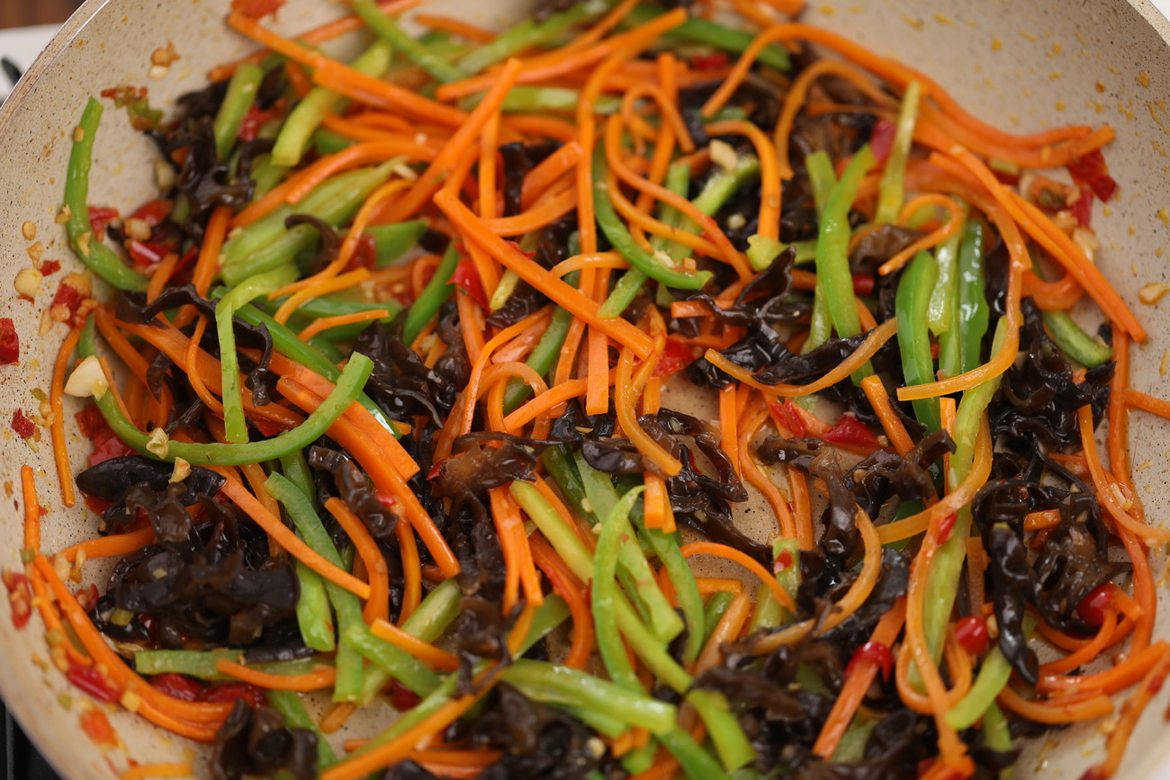 YOOZ电子烟蔥蒜末爆香,下木耳、青椒、胡蘿蔔絲,翻炒2-3分鐘。