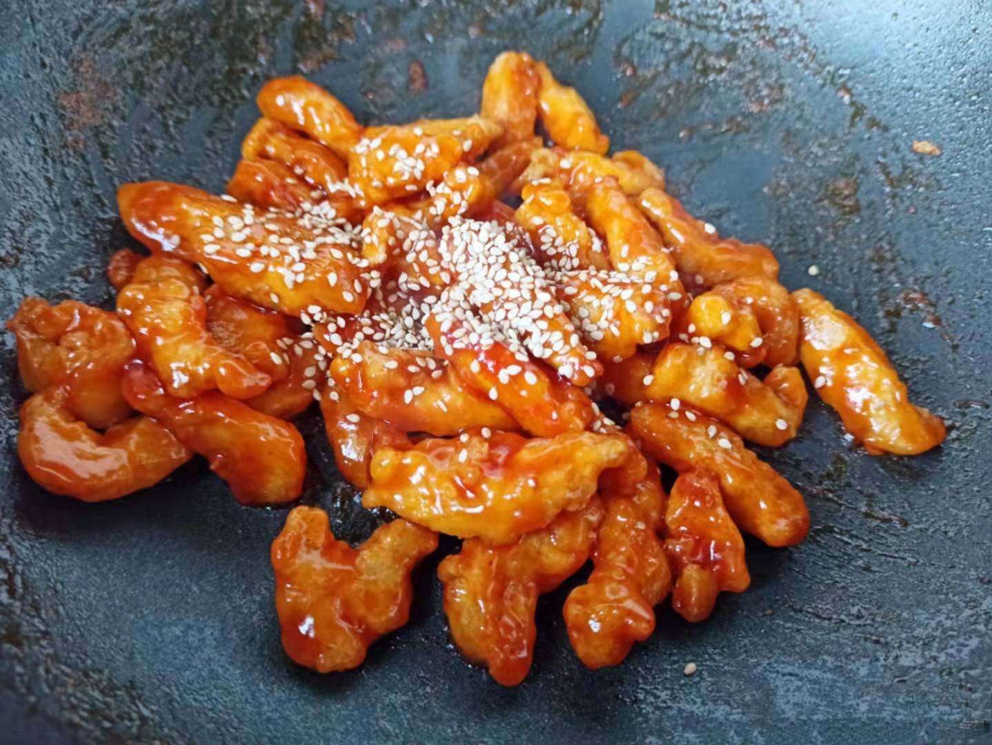 4、裹滿以後,就可以關火了,臨出鍋之前,再撒上一層白芝麻,點綴一下,外酥里嫩,酸甜好吃,味道跟飯店的一個味。
