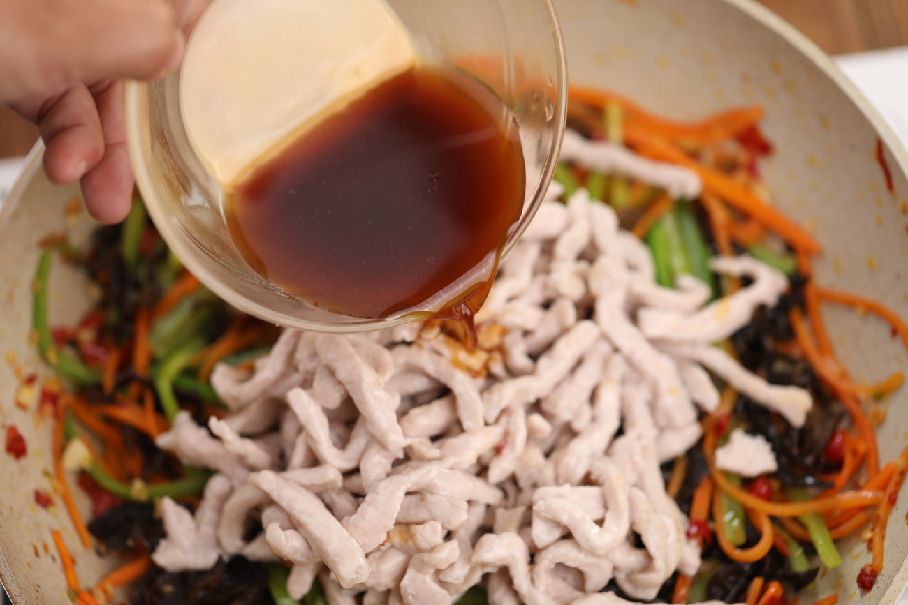 3、接著倒入肉絲,澆上魚香汁,用中火繼續翻炒。