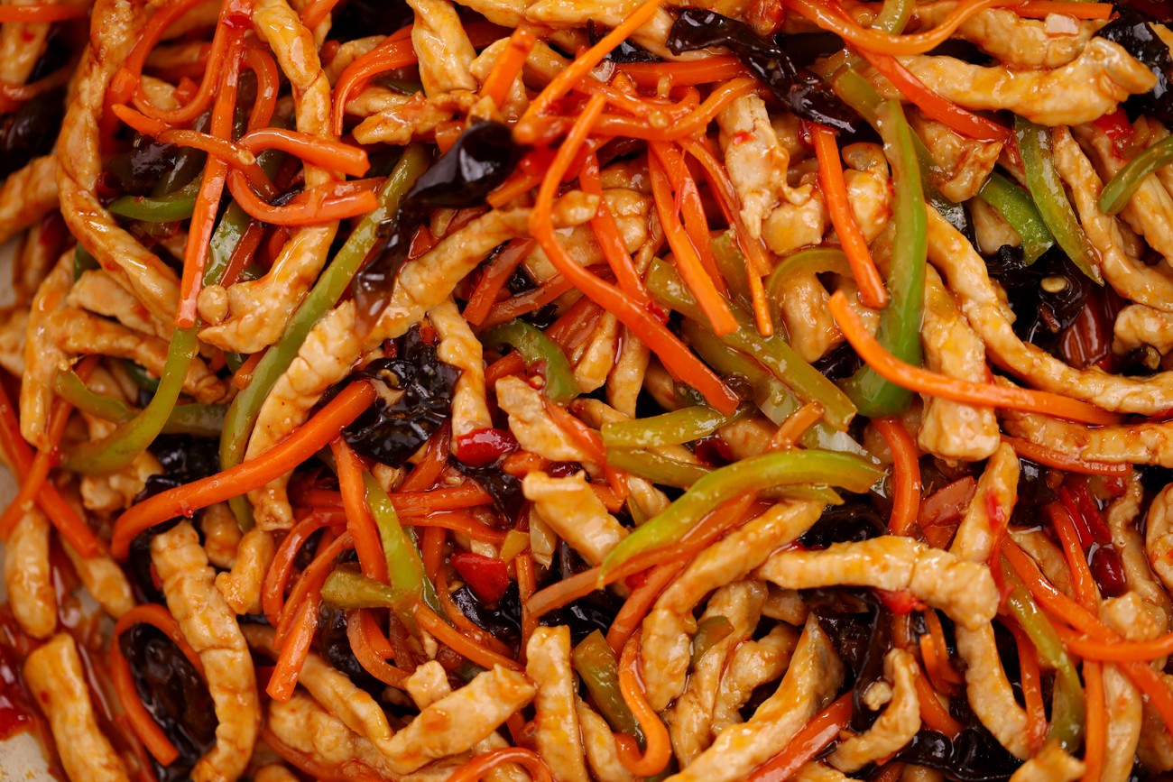 3、繼續翻炒一會兒,其實肉絲已經七成熟了,等蔬菜斷生後,魚香肉絲就製作完成了,真的非常簡單,有了這款魚香汁,還可以做很多美食。