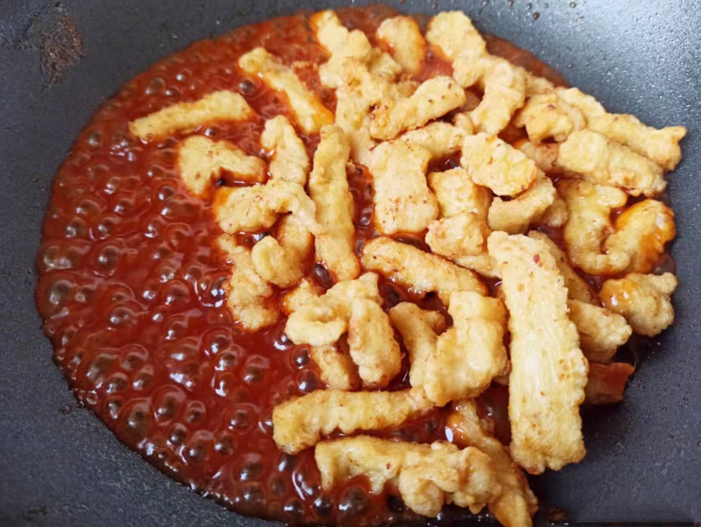 3、重新起鍋,放入少量的食用油,油熱倒入糖醋汁,小火熬製沸騰,要邊熬邊攪動,接著倒入炸好的肉段,快速滑鏟,讓糖醋汁均勻的裹滿。