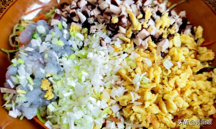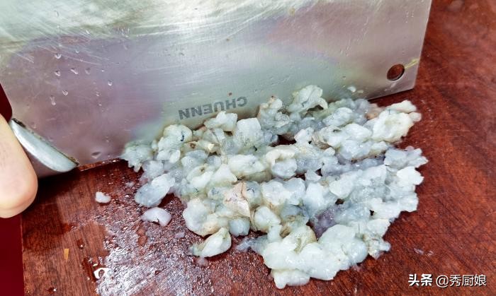 第二步:熱鍋加油,打入一個雞蛋,將雞蛋炒碎,炒熟後,放涼備用,取幾個香菇,焯水後,撈出瀝乾水分,切成小粒,取8個大蝦,將蝦肉取出,切成小粒,用刀背剁成泥。