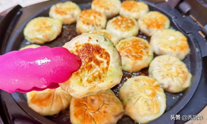 第四步:準備適量的餃子皮,用擀麵杖將餃子皮擀薄擀大,加入適量的菜餡,收口捏緊,將菜餡包起來,按壓成餅,電餅鐺提前預熱,刷一層油,將餅胚放入鍋中,在餅胚表面也刷一層油,蓋上鍋蓋,選擇餡餅模式,烙3分半鐘,烙至兩面金黃,即可出鍋。