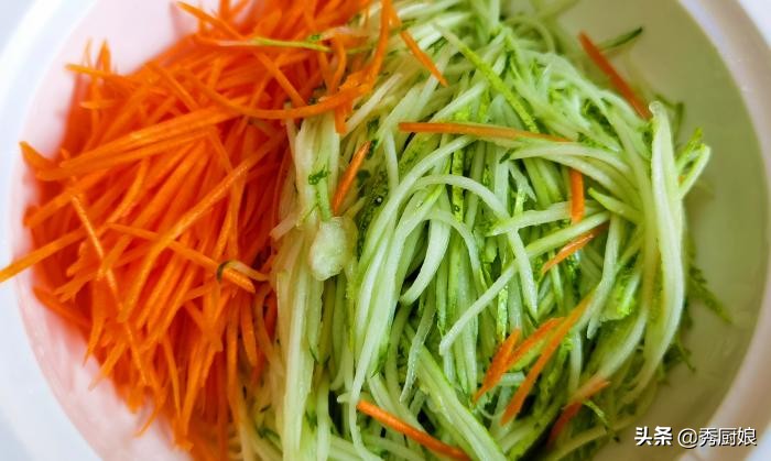 第一步:做餡餅首選老黃瓜,將黃瓜清洗乾淨後,用擦絲器擦成細絲,胡蘿蔔清洗乾淨後,也擦成細絲,將黃瓜絲和胡蘿蔔絲裝入盆中,加入適量的鹽,抓拌均勻,醃製10分鐘。
