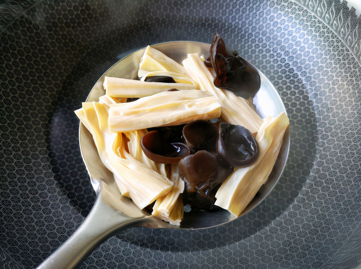 第一步、腐竹用上面的方法泡發,撈出沖洗乾淨,瀝乾水分。木耳用溫水泡發。