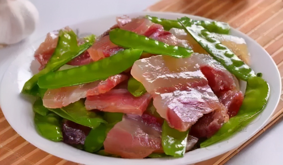 食材:臘肉、荷蘭豆、醬油、料酒、油