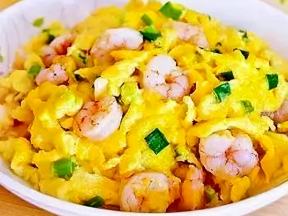 - 將燙過的蝦仁放入蛋液中,加入蔥花、水澱粉混合均勻