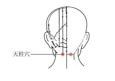 它位於頸部,在顱骨底端往下兩食指寬處。手指從後頭骨正下方凹處往下移動。頸椎兩側分別有一塊突起的肌肉,也就是斜方肌,天柱穴就在此肌肉外側凹處。