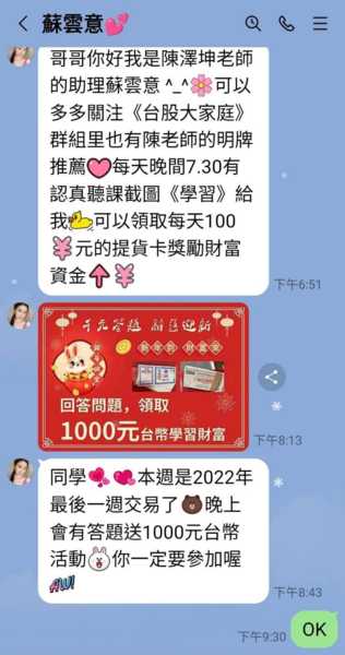 100% 的股票詐騙集團都用 LINE 拉群,群內標配老師 + 美女助理 + 幫腔帳號若干。基本套路如下: