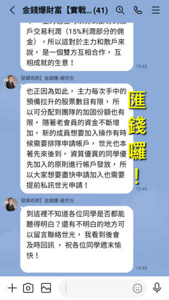 詐騙老師:楊世光(冒名) 詐騙助理:Jenny珍妮 詐騙社群:金錢爆股市分享匯 這團廢話很多,不管是「財經」組、「新視野」組或是「金錢爆」組,只會跟你扯「主力」與「資金」。喜歡用假老師帳號一對一聊,一...