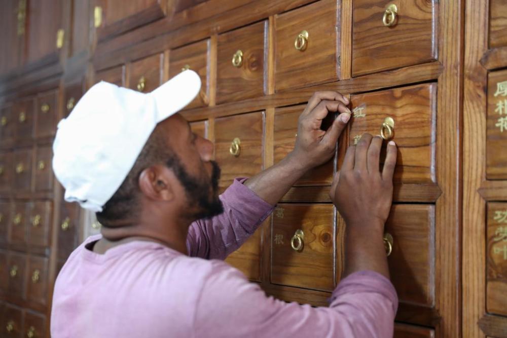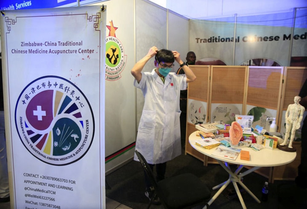 4月29日,中國-津巴布韋中醫針灸中心負責人、中國援津醫療隊隊長朱偉在津巴布韋布拉瓦約的津巴布韋國際貿易博覽會中醫藥展台工作。新華社發(肖恩·朱薩攝)