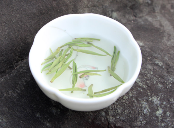 其乾茶條索直挺秀麗,緊結勻齊,銀毫滿披,看起來翠綠油亮,有一股馥郁持久的蘭花香氣,成湯後,湯色呈現杏綠色,清透明亮,喝起來鮮醇爽口,回味甘甜,香氣鮮嫩清幽,沁人心脾,葉底勻齊呈朵。