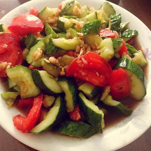 1、黃瓜去皮切滾刀塊,番茄洗淨切塊備用。