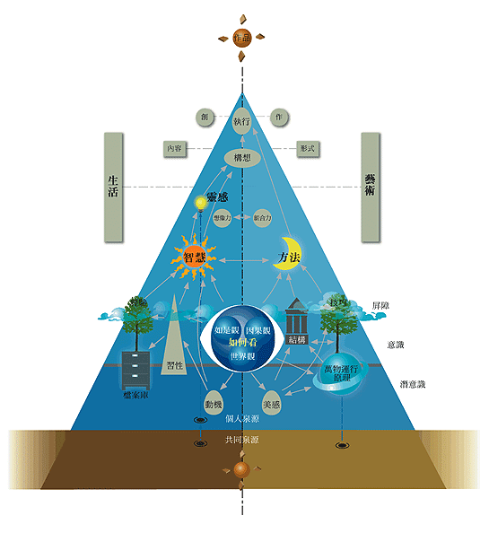 我把這新看法寫在一張明信片上,將創意學習剖成兩種不同範疇的工作。後來演變成本書的「創意金字塔」。回台北以後,我花了兩天時間,在安靜的紫藤廬茶館把這些新看法講述給一組研究生聽,他們反應很熱烈,並把講演整理成簡單的稿子。後來在一些機緣下,幾位早已畢業的碩士生希望繼續和我上課,我就根據這些,定期在家向他們說明創意(他們稱為「賴老師的私塾」)。我看到他們吸取營養,日後各自在自己的創作領域中突破、進步,發現這新的心得是有效的。透過這過程,以及日後在北藝大博士班開設的「創意」課程中,我也有機會檢視、修飾自己的想法。
