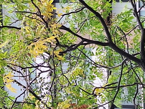 中間安全島的樹木樹葉也是綠黄相間,貌似阿勃勒的花樣(如文中的照片第4~6張),遠看一度誤以為是阿勃勒,仔细看樹牌才知是苦楝樹。苦楝樹長大成人(目前都尚年幼)後開的紫色花也非常驚艶。