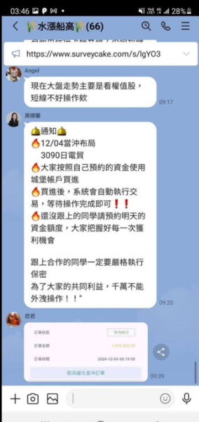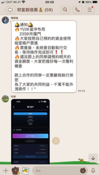 2️⃣ 當被害者上鉤後,歹徒會介紹其他「客服、老師、助理」同夥加 LINE 聯繫或加入LINE投資群組,並提供假投資網站或App給被害人註冊、下載安裝及操作,此時LINE群組內不斷有其他假學員獲利貼文。