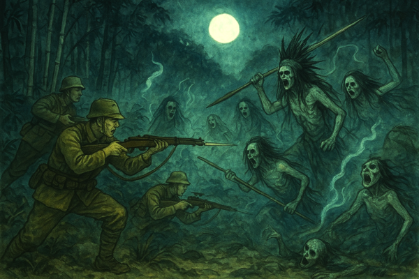 平台周圍慢慢出現一團朦朧灰黑形體,一群群日軍與部落勇士等孤魂戰鬼,或持槍或拔刀,展開一場瘋狂廝殺怒吼之戰。這些幽靈戰鬼中有斷頭、被削去臉孔、身體出現大窟窿…。