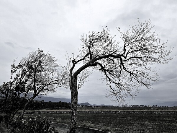 最後來到伯朗大道,才驚覺秋收後的池上竟有一種滄桑之美。記憶中那鋪天蓋地的金黃與翠綠已不復見,取而代之的是一畝畝赤裸的泥土,充滿了冬藏的荒蕪感。那棵名滿天下的金城武樹,如今需靠鐵線支撐固定,唯有樹下的奉茶區,依然以同樣的姿態迎來送往。