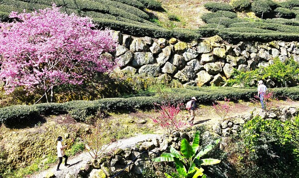 當山風掠過,櫻花始與枝頭及山巒告別,然而樹上有的正開的盎然,有的卻已隨風入泥。淡粉的花瓣輕輕淺淺地飛舞著,不急不緩,落在行人的髮尖,跌進古老的岩層,也落入了茶樹的懷抱 。