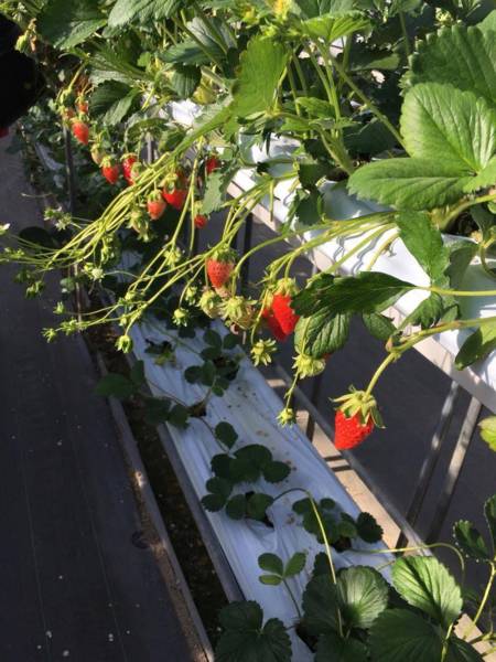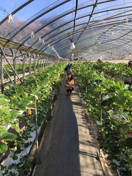 車子開了5分鐘,就看到一個溫室中的草莓園。這邊的草莓與台灣有點不同的是,種在空中,所以一分土地可以種兩到三層草莓,好像滿省地的呢!!(笑)