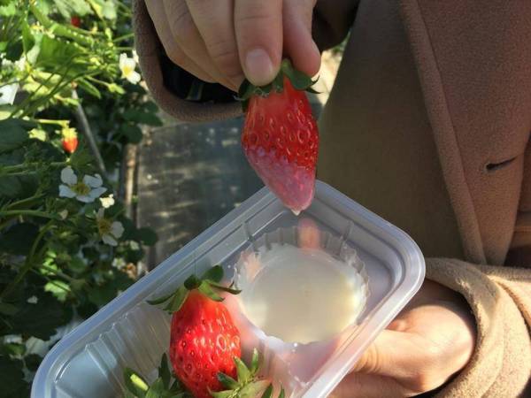 從管理員手上拿到一盒煉乳,配著剛摘下的新鮮草莓,好甜好好吃~
