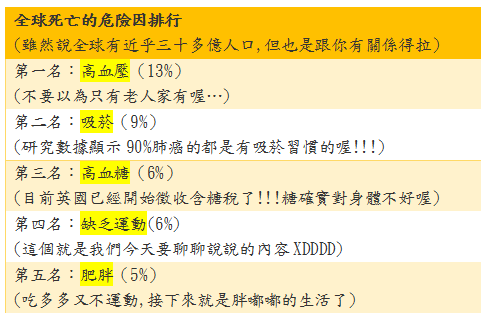 而今天當中會特別針對第四名的缺乏運動來探討~