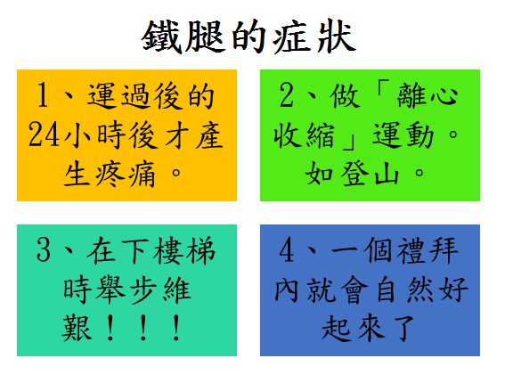2、並不是所有運動都會發生,要有所謂的「離心收縮」運動才會有發生鐵腿的狀況。舉例來說,登山完後就容易發生。