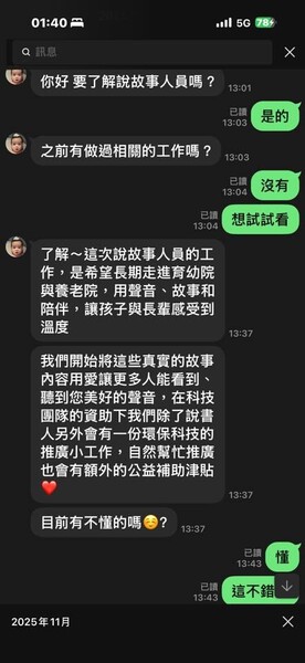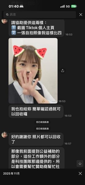 再一個偶然的機會看到TikTok在找說故事人員,自己在好奇心的驅使下就加入了那個女人(指導員)的賴,她是用小朋友的頭像讓妳先暫時放下防備心,她問了一些問題要我自拍比個四證明自己不是假人,後面就跟你說到「公益補助的部分,這份工作額外的部分是科技團隊那邊提供的,所以會需要幫忙贊助商幫忙社群推廣 這都是自發性的 只是想要把向善的理念傳遞下去」,「工作內容的話主要的性質 是在配合政府推動AI環保推廣 協助台灣爭取國際競爭優勢」,說了一些這樣的話就拉我進去一個AI的群組,剛開始確實讓妳錄了故事,也讓妳領到了一則故事500的補助,至於Ai的操作就像我分享的影片那樣操作方式,還有特助、營運長!