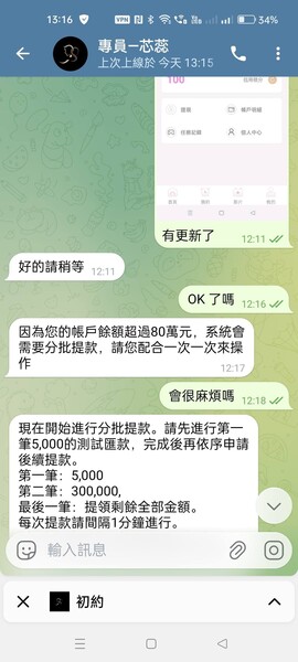 在IG的廣告加入Line帳號,再轉TG ,名為配對經紀人,入會費1000元,約會還需要登記入金驗證才算成功,第一次5000返還6000,第二階段21000,然後會拉進一個四人小群,名為任務群,要四個人一起完成才行,只要有人失敗,四人都算失敗,然後因為指示有誤導導致任務失敗,需要兩次恢復數據保證金,四人都要上交50000,第二次十萬,成功了再一次全部退還約22萬元左右金額,但是一開始做任務失敗的那人,則需要第三次提領數據恢復的保證金35萬,結果因為提領順序錯誤導致帳戶凍結,這次需要80萬保證金解凍,解凍以後會再退還加返利。 經我研究,台灣這方面相關訊息很少,貌似是從對岸同城約炮的模式引進來的,而且會員大多是有家庭老婆的人,導致報案數相當低。真是可怕,引以為鑑。