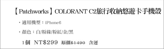 商品訊息簡述: 只要299元即可購得【Patchworks】原價1490元COLORANT C2旅行收納悠遊卡手機殼1個,適用機型:iPhone6,顏色:白/粉綠/粉紅/金/黑。