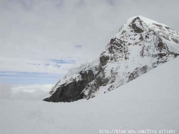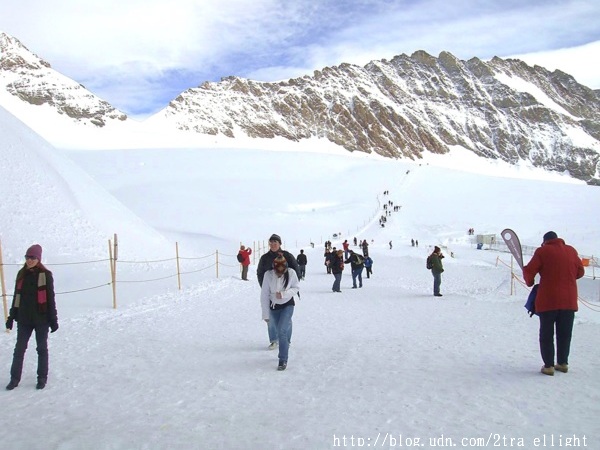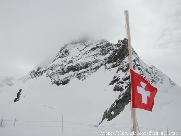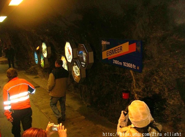齒輪火車通頂前, 會在海拔2865米的艾格萬德隧道站(Eigerwand)和海拔3160米的冰海站(Eismeer)短暫逗留5分鐘左右, 讓乘客下車到觀景台欣賞群山圍繞的風景, 可惜只看見白茫茫一片. 雨雖然停了, 山脈都被一層層的霧遮蓋. 抱著忐忑的心上山頂.