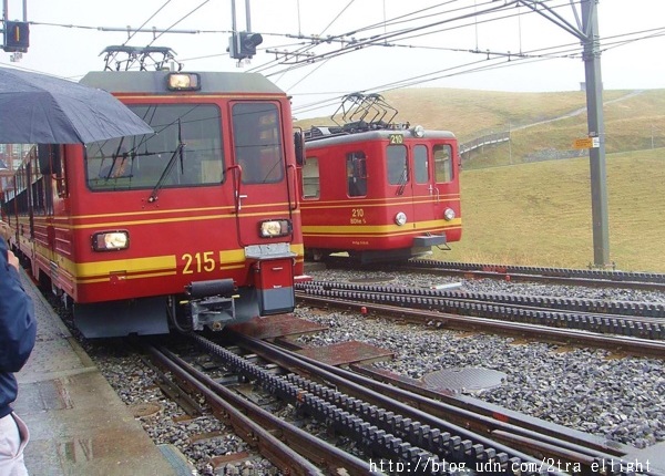中途換齒輪火車上山時, 開始下雨了, 心想完蛋了,到了山頂該不會被濃濃的雲霧包圍,什麼都看不見吧?