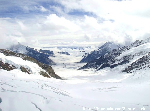 一到山頂, 真是謝天謝地, 天氣晴朗, 迫不及待的往戶外冲, 藍天白雲下的阿雷奇冰河(Aletsch Glacier), 我來了!