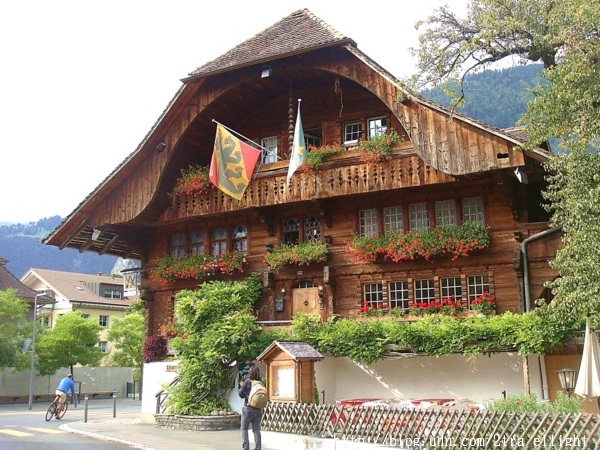 抵達因特拉肯的第一天已經是下午,沒安排任何行程, 鎮上的歐式木屋建築,值得放慢腳步去欣賞.即使Balmer Guesthouse有提供每人一張免費的公車一日卷, 我還是選擇了走路,在大街小巷隨意逛.