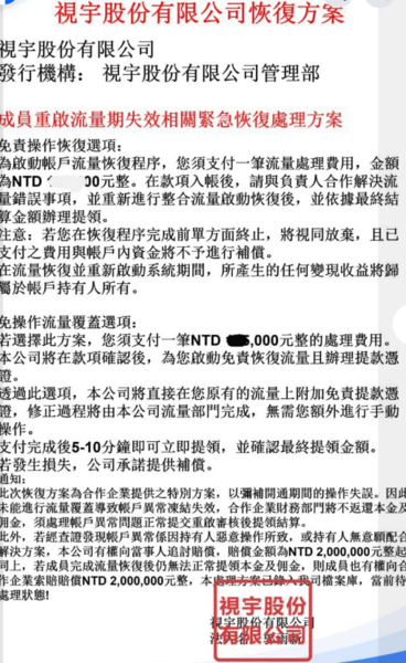 視宇公司是一個假投資(博弈)詐騙平台,持續收割投資人資金!許多受害者因無法提領資金而蒙受重大損失。詐騙集團利用互聯網搭建虛假投資平台,以「高收益」「低風險」「穩賺不賠」等話術吸引投資人。實際上根本無法出金,還會找各種理由要求受害者繼續匯款。