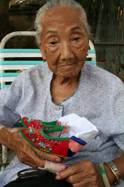 小金門上林村厲王爺宮旁的龍眼樹下,總會看到九十五歲的陳林蔭,靜坐在躺椅上,用爬滿皺紋的巧手,一針一線地刺繡出花色豔麗的三寸金蓮,細細描繪著絲緞花布下,屬於她的那段過往年華。