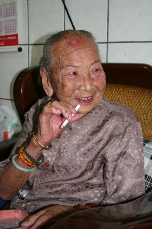 九十四歲的老阿嬤陳寶鳳,熟練而豪氣地抖著煙蒂,發現大夥看她看得入神,「嘿嘿」乾笑二聲後說:「十幾歲就會抽」。