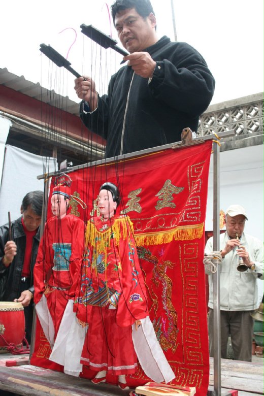 雖然才大年初二,不過,為方便子女赴台行程,有些鄉親昨日已進行「拜天公」儀式,並請來「傀儡戲」班酬神祈福,穿著大紅大藍大黃袍子的木偶,鏗鏘咚咚的鑼鼓嗩吶響聲,為新春增添不少熱鬧喜氣。